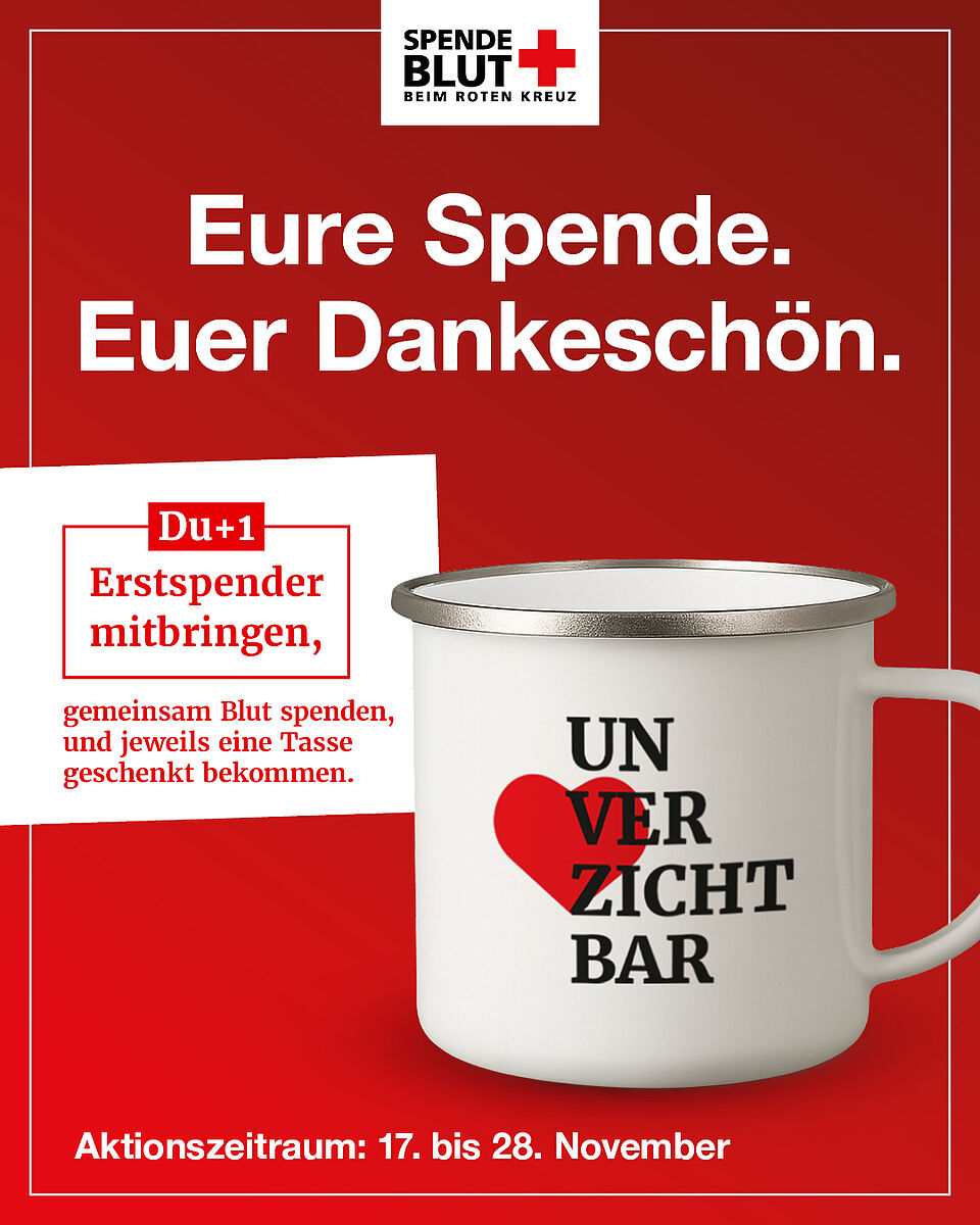 Dann ist jetzt Ihre Chance, um zu zeigen, wie einfach Leben retten sein kann: Gehen Sie zusammen mit einer Person, die noch nie Blut gespendet hat, gemeinsam Blut spenden und beide bekommen eine exklusive Tasse als Dankeschön. Gerade jetzt, wo’s draußen kalt und ungemütlich wird, können wir zusammen etwas richtig Gutes tun. Die Aktion läuft vom 17. bis 28. November.